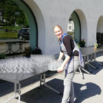 In der warmen Jahreszeit verweilen Sie im ruhigen Klosterhof mit Ausblick auf die imposante Engelberger Bergwelt.